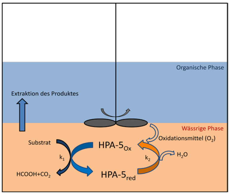 In der Arbeitsgruppe „Biomasse und nachhaltige Erzeugung von Plattformchemikalien“ beschäftigen wir uns damit, die Industriereife des OxFA-Prozesses weiter zu entwickeln. Hierfür wurde ein Upscaling durchgeführt und eine Miniplant zur kontinuierlichen Betriebsweise des Verfahrens in Betrieb genommen. Durch eine detaillierte Sensitivitätsanalyse konnten die Prozessparameter dieser Miniplant bereits optimiert werden. Durch Untersuchung verschiedener Parameter (wie Temperatur, Druck, Rührerdrehzahl, Konzentration, Volumenströme und Volumenstrom-Verhältnisse) konnten die größten Einflussfaktoren auf den Prozess ermittelt werden. Auch ein Recycling des Extraktionsmittels konnte realisiert werden. So zeigte die Verwendung von redestilliertem Extraktionsmittel in den Versuchen ebenfalls gute Ergebnisse. Sogar die Umsetzung von realer Biomasse in der kontinuierlichen Miniplant ist möglich. Neben Modellsubstraten wie Sucrose konnte vor kurzem die Oxidation von Melasse zu Ameisensäure erfolgreich durchgeführt werden.