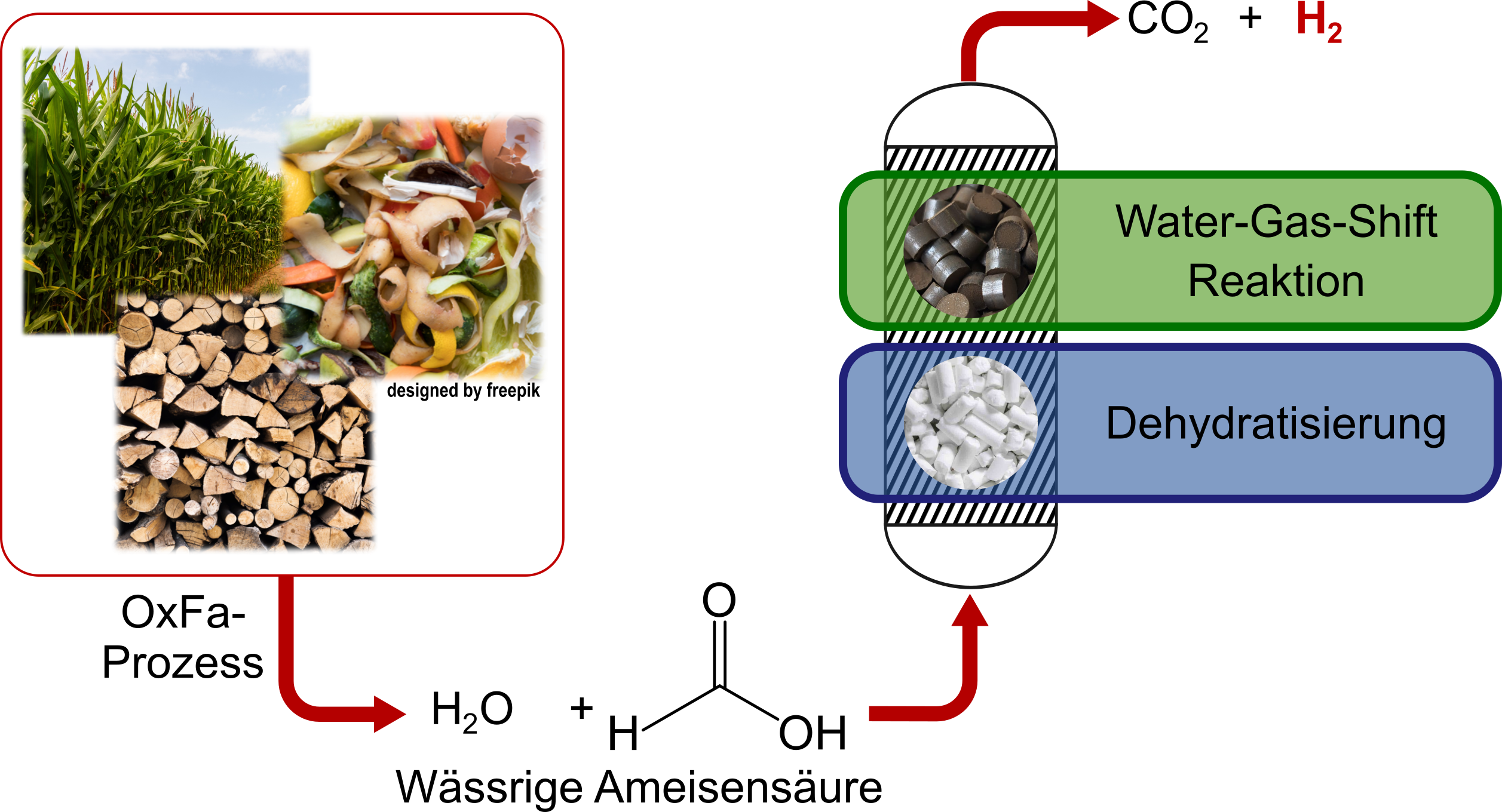 Ein alternativer Ansatz zur Herstellung von Wasserstoff aus Ameisensäure besteht darin, ein zweistufiges Verfahren zu entwickeln, wobei zunächst Ameisensäure durch saure Katalysatoren in der Gasphase dehydratisiert wird. Das hierbei gebildete Kohlenmonoxid (CO) und Wasser (H2O) werden anschließend durch die Wasser-Gas-Shift-Reaktion (WGS) zu Kohlendioxid (CO2) und Wasserstoff (H2) umgesetzt.