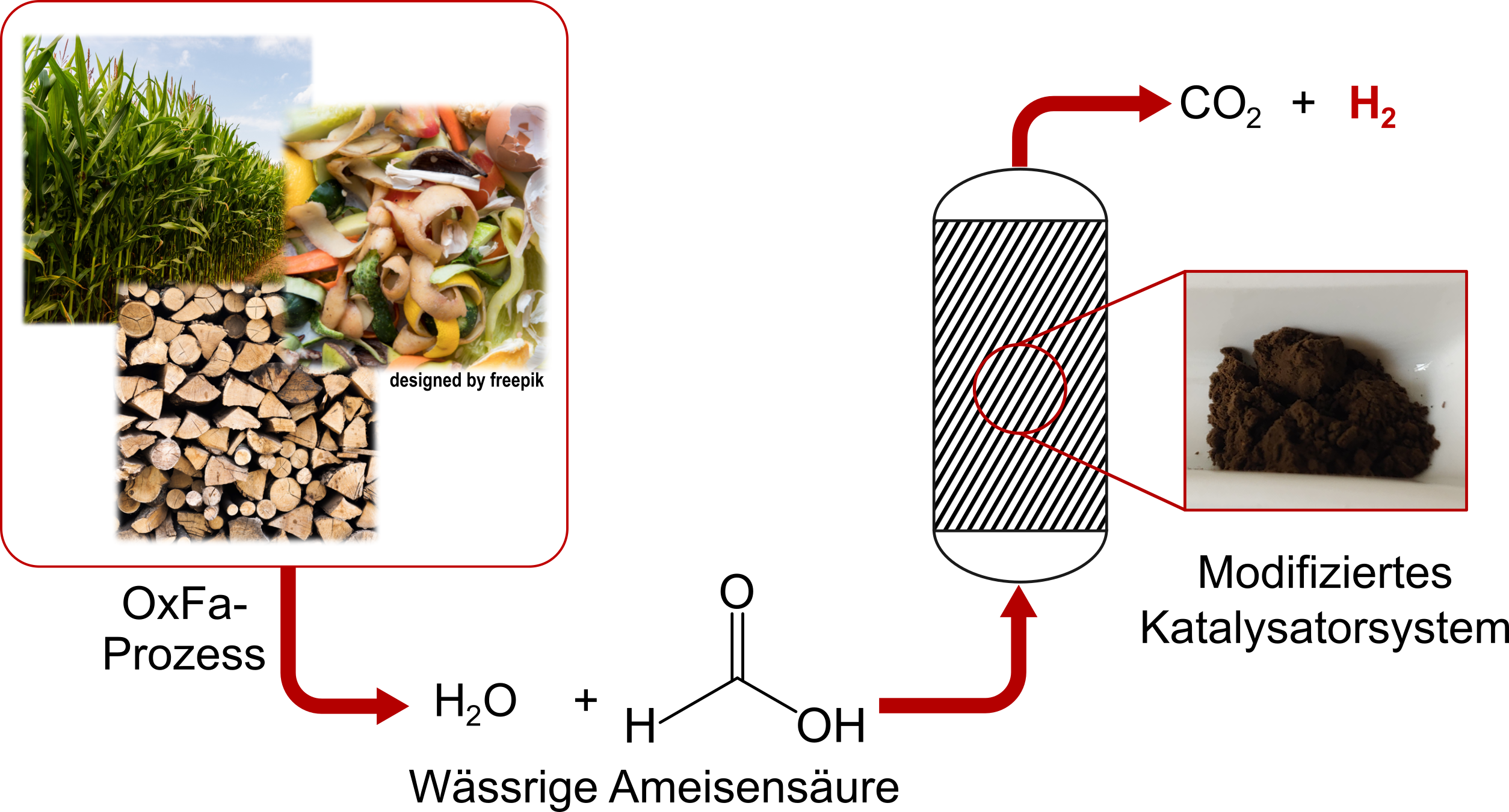 Eine vielversprechende Alternative zu fossilen Brennstoffen stellt Wasserstoff biogenen Ursprungs dar. Im Rahmen des BMFTR-Projektes wird die Dehydrierung von Biomasse-stämmiger Ameisensäure für die Wasserstoffproduktion verfolgt. Das Konzept bietet den Vorteil der räumlichen und zeitlichen Entkopplung von Biomassenutzung und Wasserstofferzeugung. Für die Dehydrierung der Ameisensäure können verschiedenste Katalysatorsysteme, sowohl homogen als auch heterogen, eingesetzt werden. Heterogene Katalysatoren sind dahingehend für den technischen Prozess von Vorteil, da eine einfache Katalysatorabtrennung auch bei hohen Wassergehalten der wässrigen Ameisensäure möglich ist.