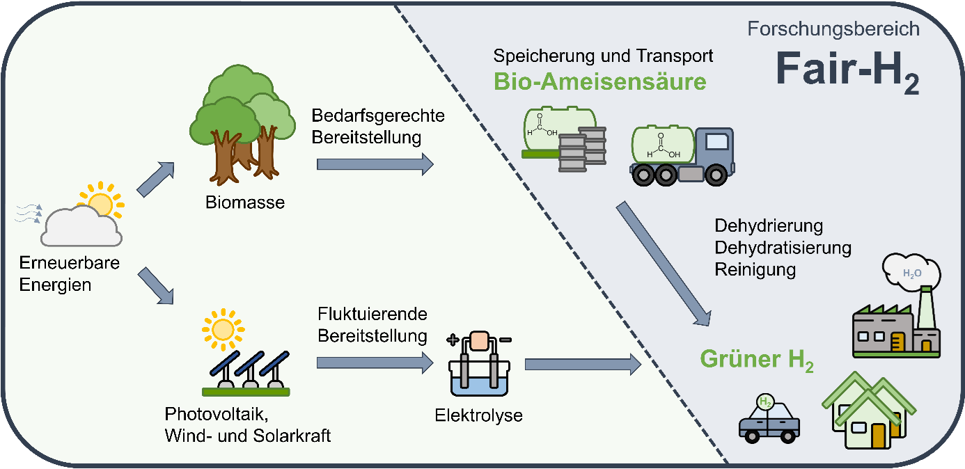 Das BMFTR Projekt Fair-H2 zielt darauf ab, eine neuartige Methode zur Herstellung von grünem Wasserstoff aus Abfallbiomasse zu entwickeln und wissenschaftlich zu evaluieren. Durch eine detaillierte Untersuchung und Optimierung der Prozessschritte wird die maximale Effizienz und Nachhaltigkeit angestrebt. Die experimentellen Ergebnisse aus den jeweiligen Teilbereichen werden durch Prozesssimulationen und Sensitivitätsanalysen ergänzt, um die Auswirkungen auf die Gesamteffizienz des Prozesses abzuschätzen und die Apparate und Wärme-Verschaltungen entsprechend auszulegen.